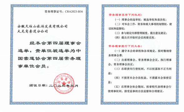 安徽天柱山旅游發(fā)展有限公司大龍窩索道分公司成為中國索道協(xié)會常務(wù)理事單位之一,是天柱山大龍窩索道發(fā)展史上重要的一步,有利于促進(jìn)天柱山大龍窩索道與中國索道協(xié)會及相關(guān)企業(yè)的交流與合作,促進(jìn)行業(yè)協(xié)會的資源共享和優(yōu)勢互補,進(jìn)一步拓展大龍窩索道在索道技能項目領(lǐng)域的專業(yè)度、創(chuàng)新性和影響力。同時,大龍窩索道作為常務(wù)理事單位,也將積極履行職責(zé)和義務(wù),促進(jìn)組織發(fā)展和提高人才資源素質(zhì)。發(fā)揮天柱山大龍窩索道在索道協(xié)會常務(wù)理事單位職能,助推中國索道行業(yè)的高質(zhì)量發(fā)展具有里程碑的意義。(文:汪全龍)